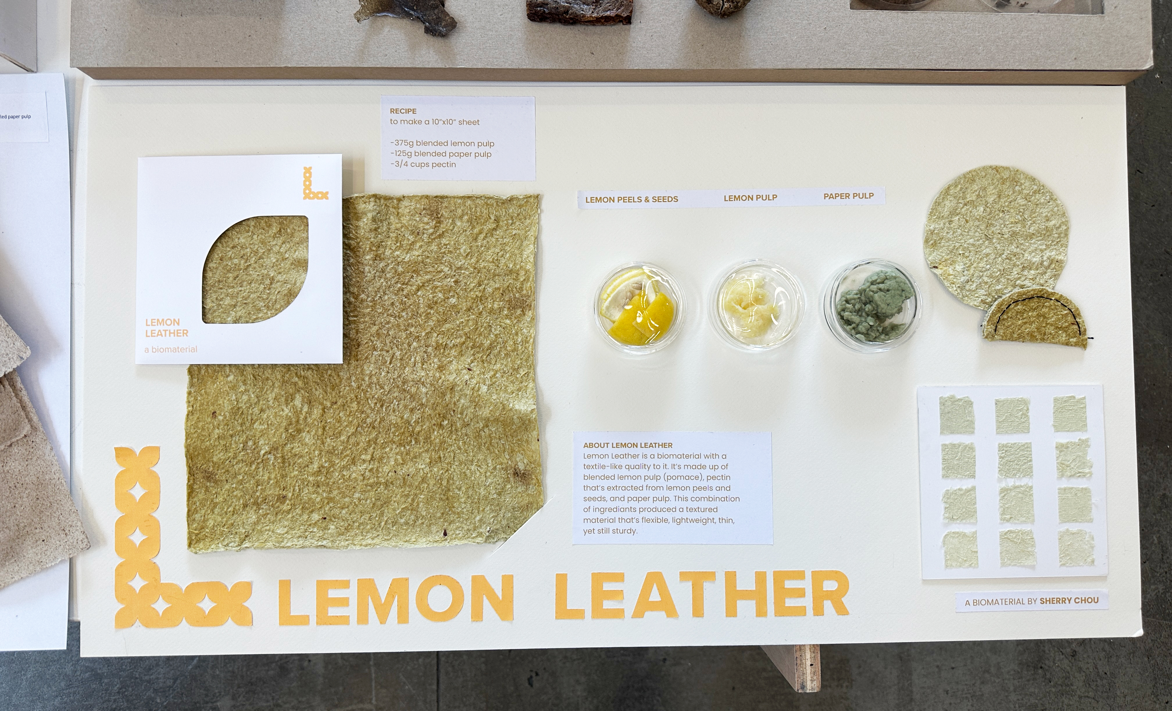 a biomaterial i created out of lemon waste and paper pulp. the main objective for the project was the creation and implementation of a self-made biomaterial in a way that would help create a closed loop waste stream in an industry. i decided to also undergo a personal branding project on the side to give my biomaterial more substance as a design object.