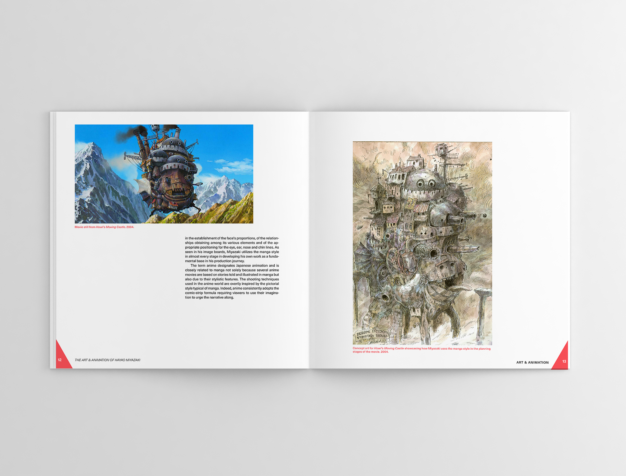 an artwork catalogue showcasing text and images about japanese animator hayao miyazaki. colors and graphic elements used in the design come from the importance of warm, red tones in miyazaki’s films and the traditional japanese hexagonal pattern that stands for longevity, depicting the timeless quality of his films.