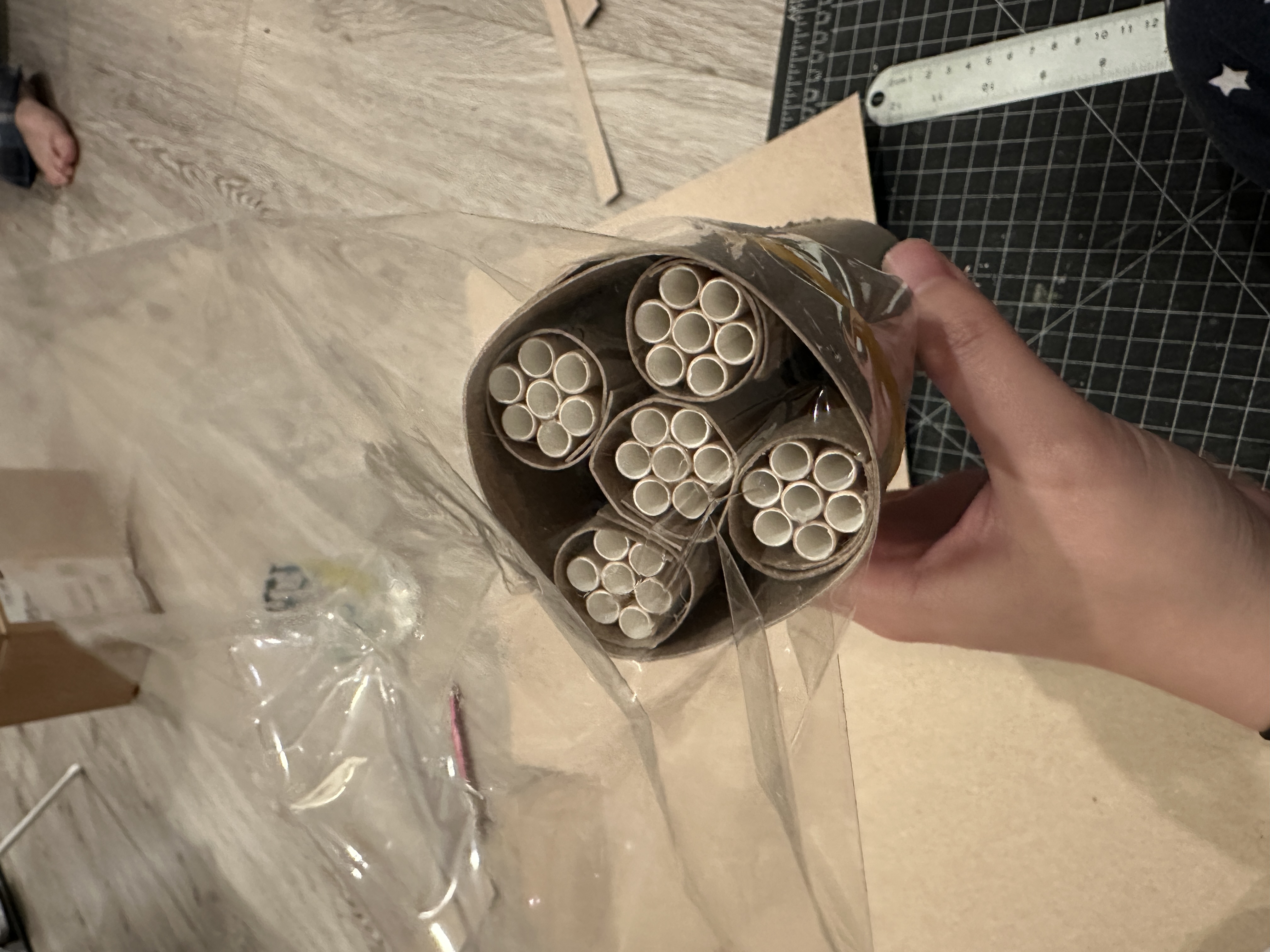 from left to right, prototype 5 had paper straws glued on the inside going only in one direction, prototype 6 had a lattice of pipe cleaners glued in every layer, and prototypr 7 had the same lattice structure but with cotton balls added.
