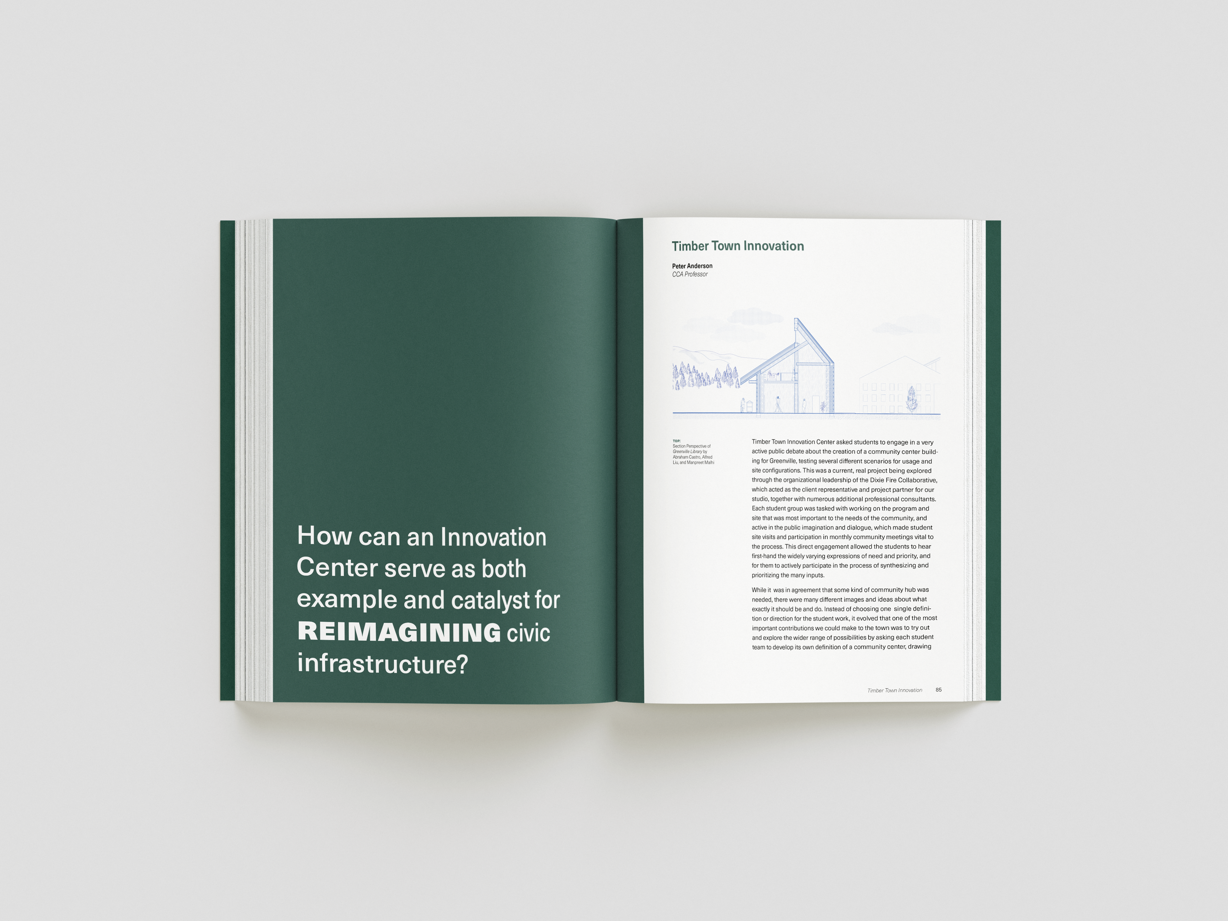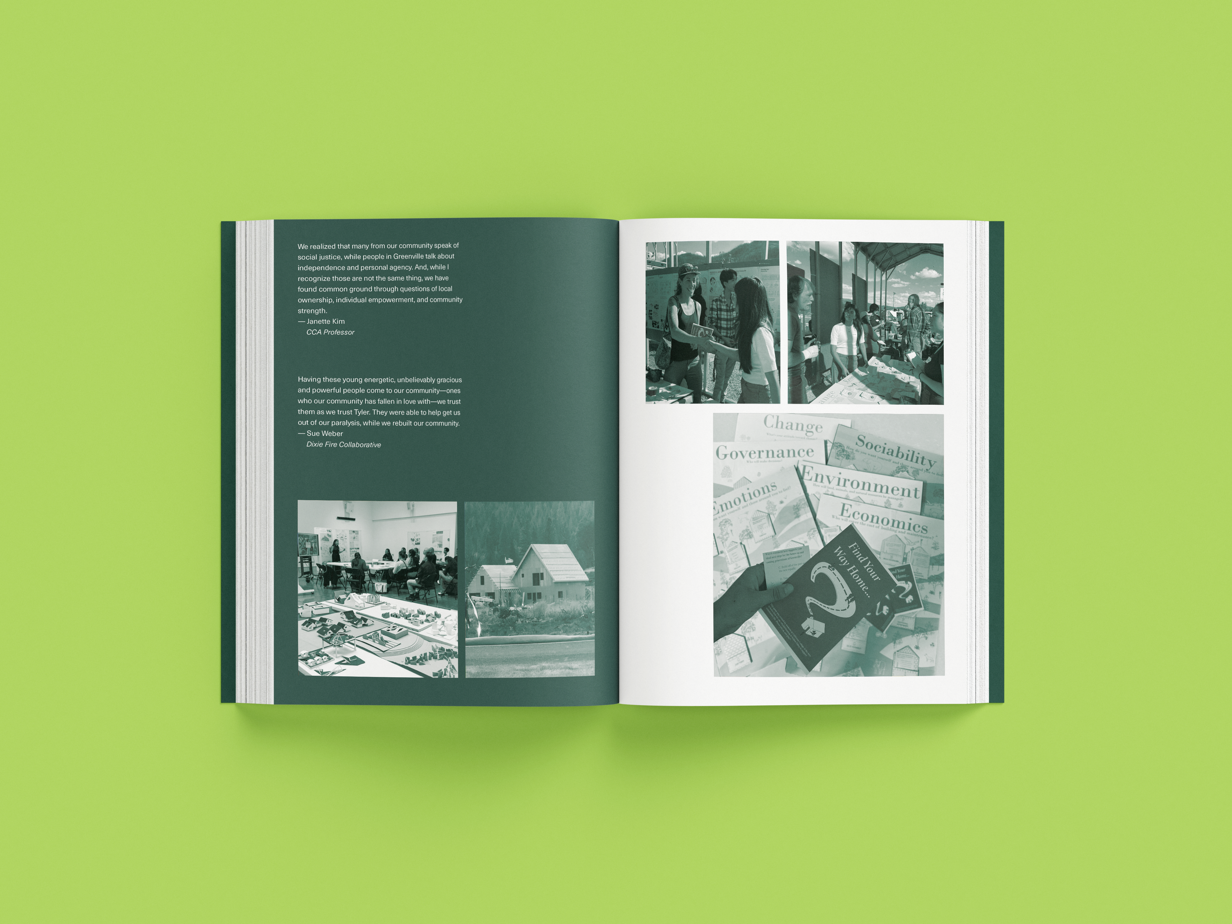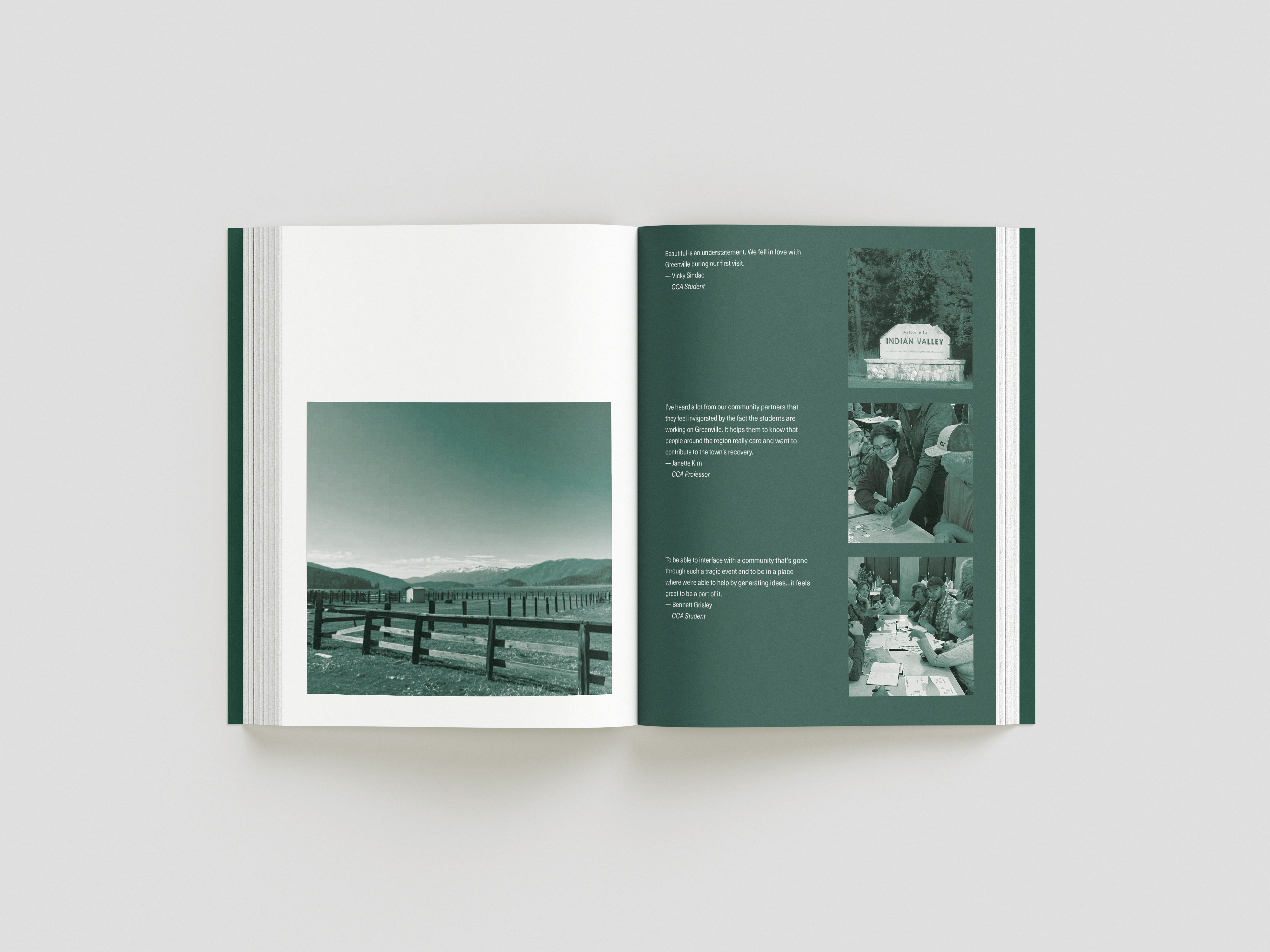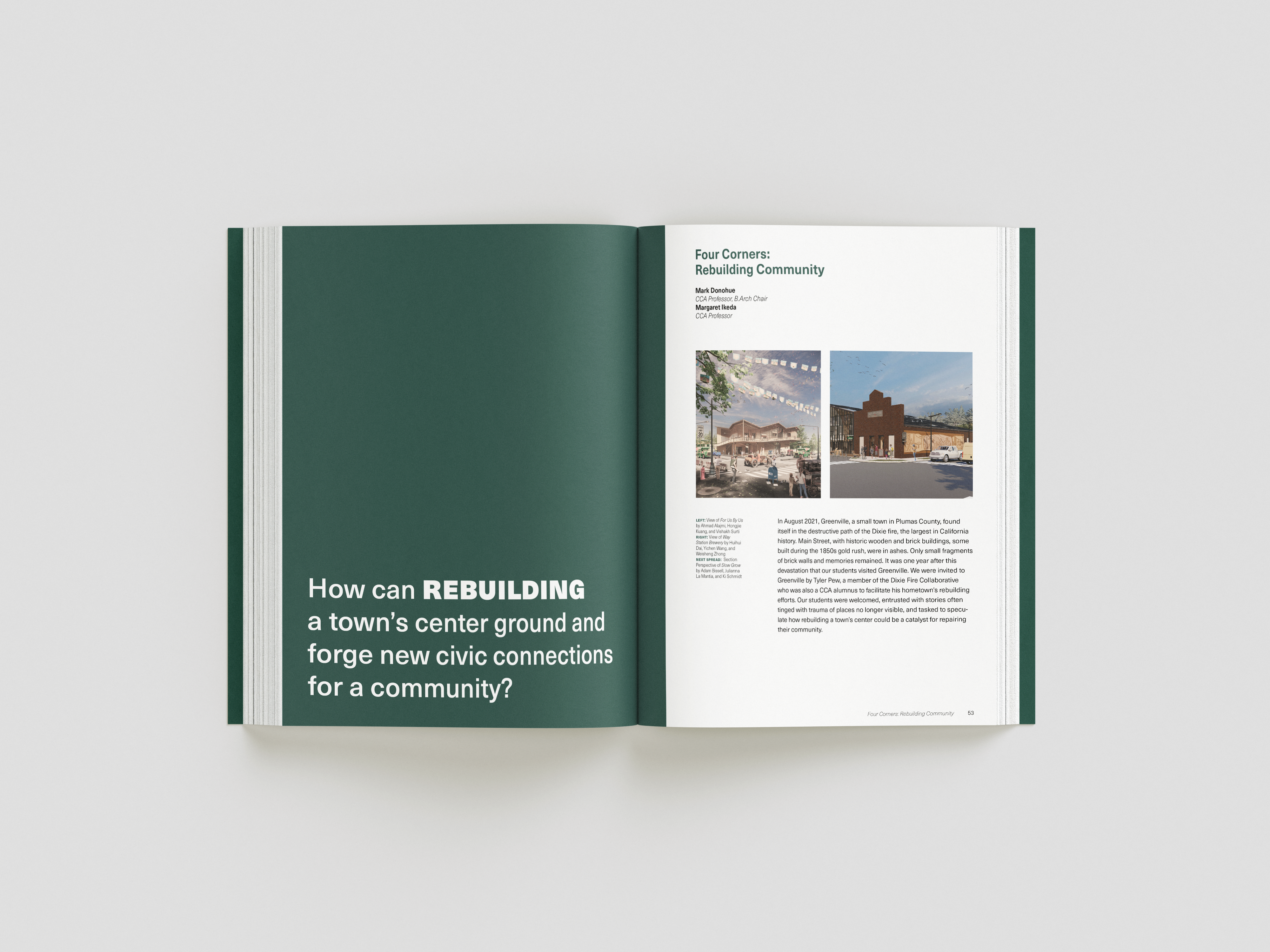while taking bob aufuldish’s editorial design class, i was selected for an opportunity to design a book for cca’s architecture program. the program offered classes from 2022-2024 that gave students an opportunity to design new buildings and structures for the town greenville after it was almost completely destroyed by the dixie fire in 2021. this book is a documentation of their experiences, final projects coupled with stories from the townspeople who survived and hope of rebuilding.
