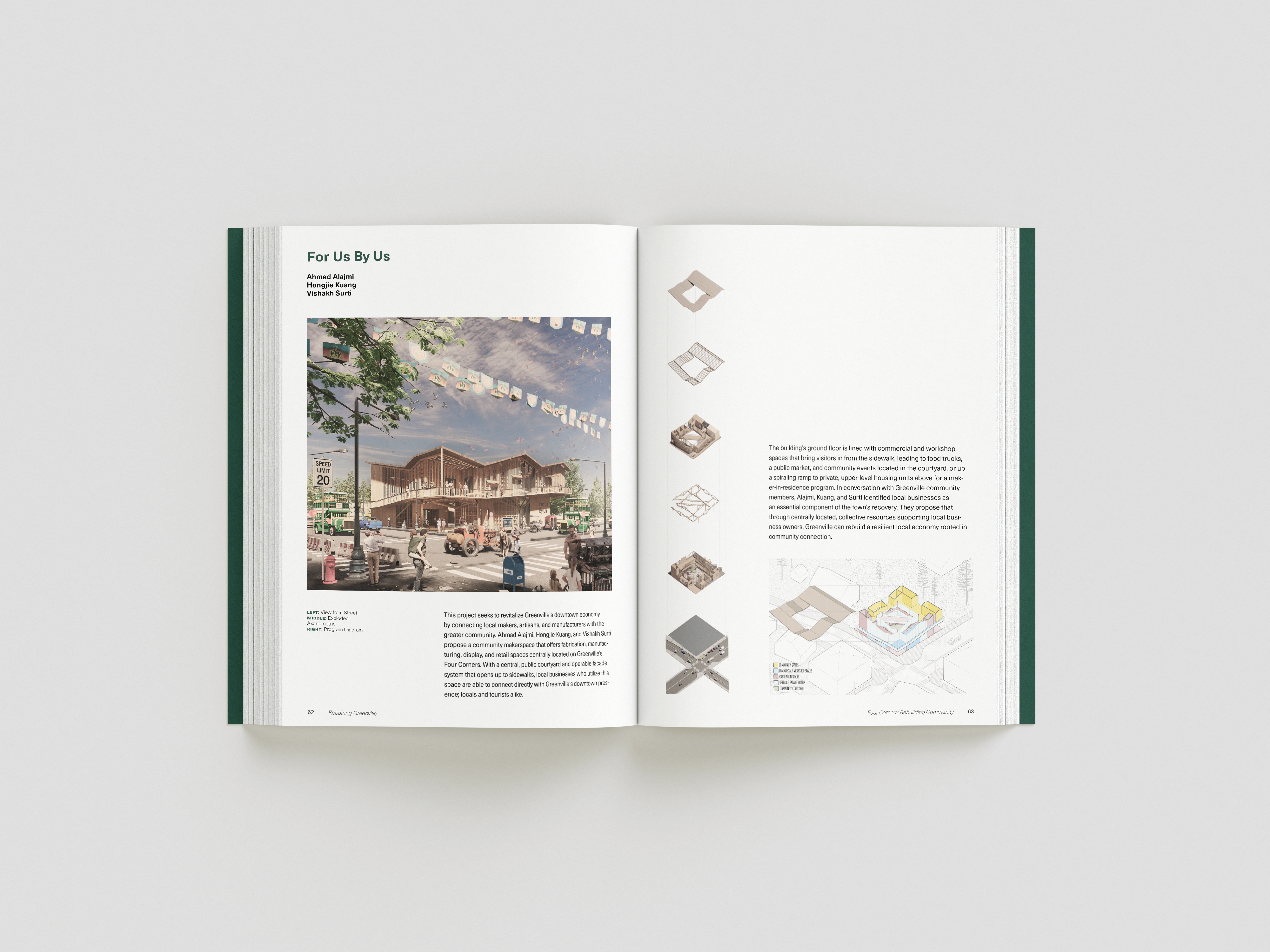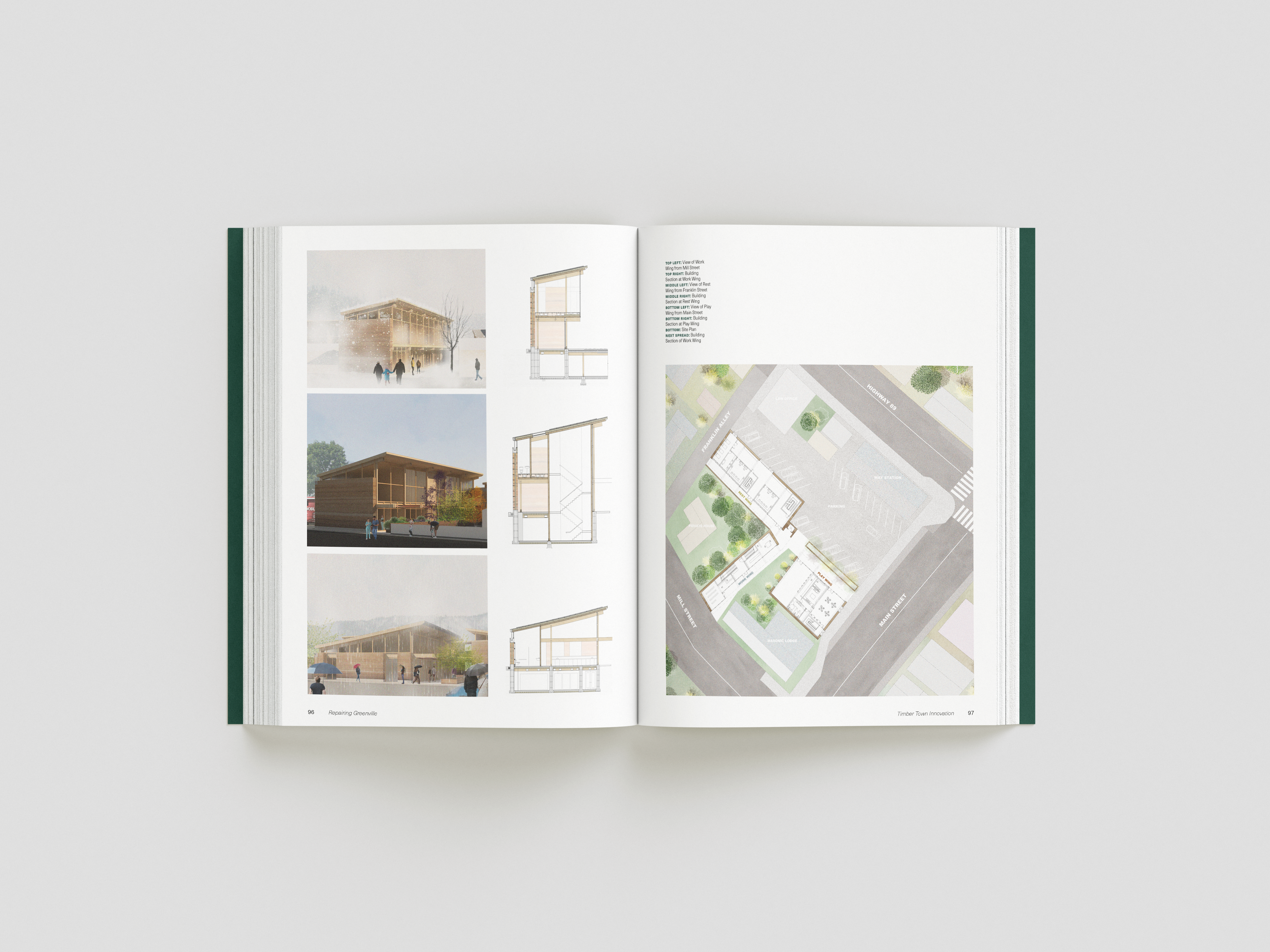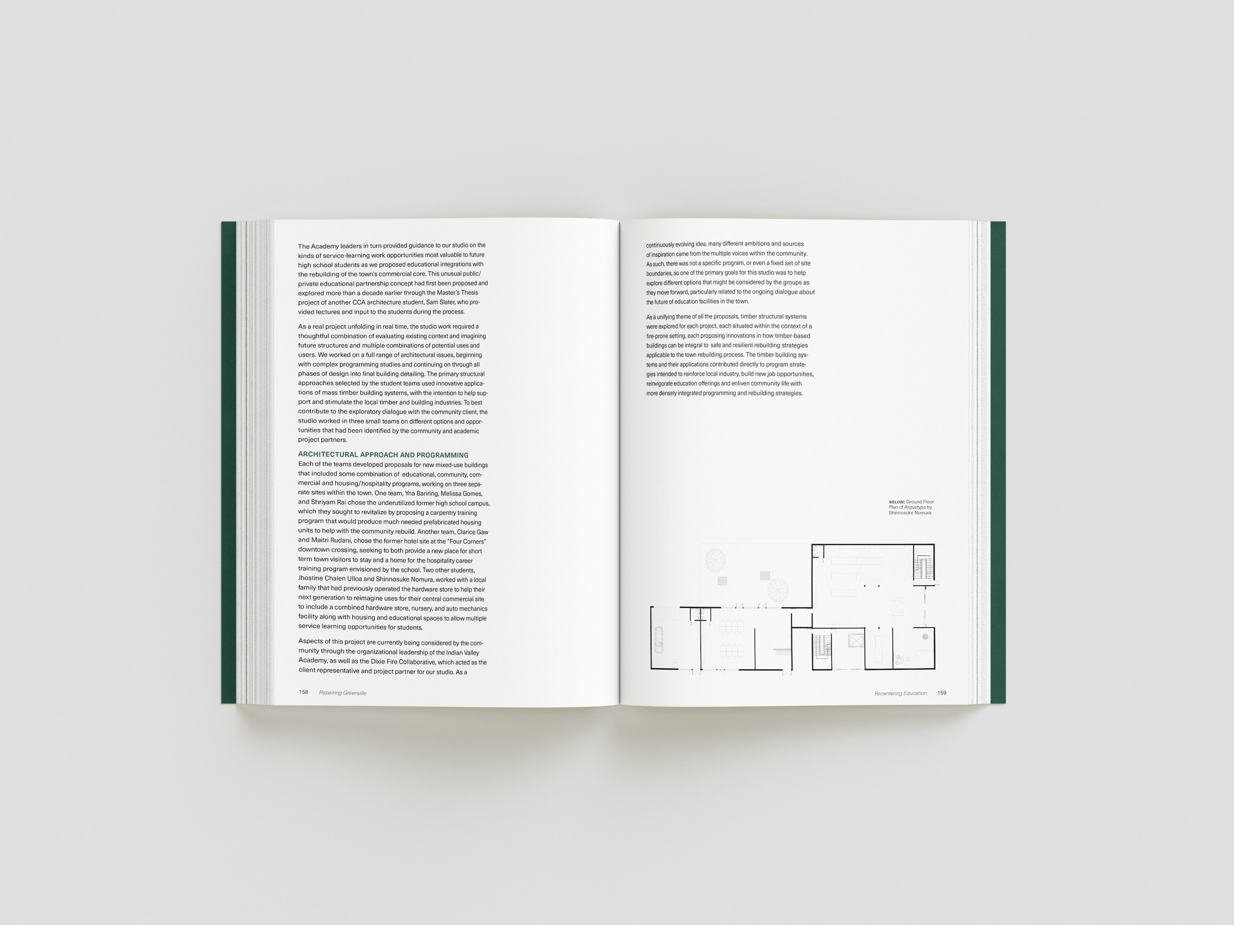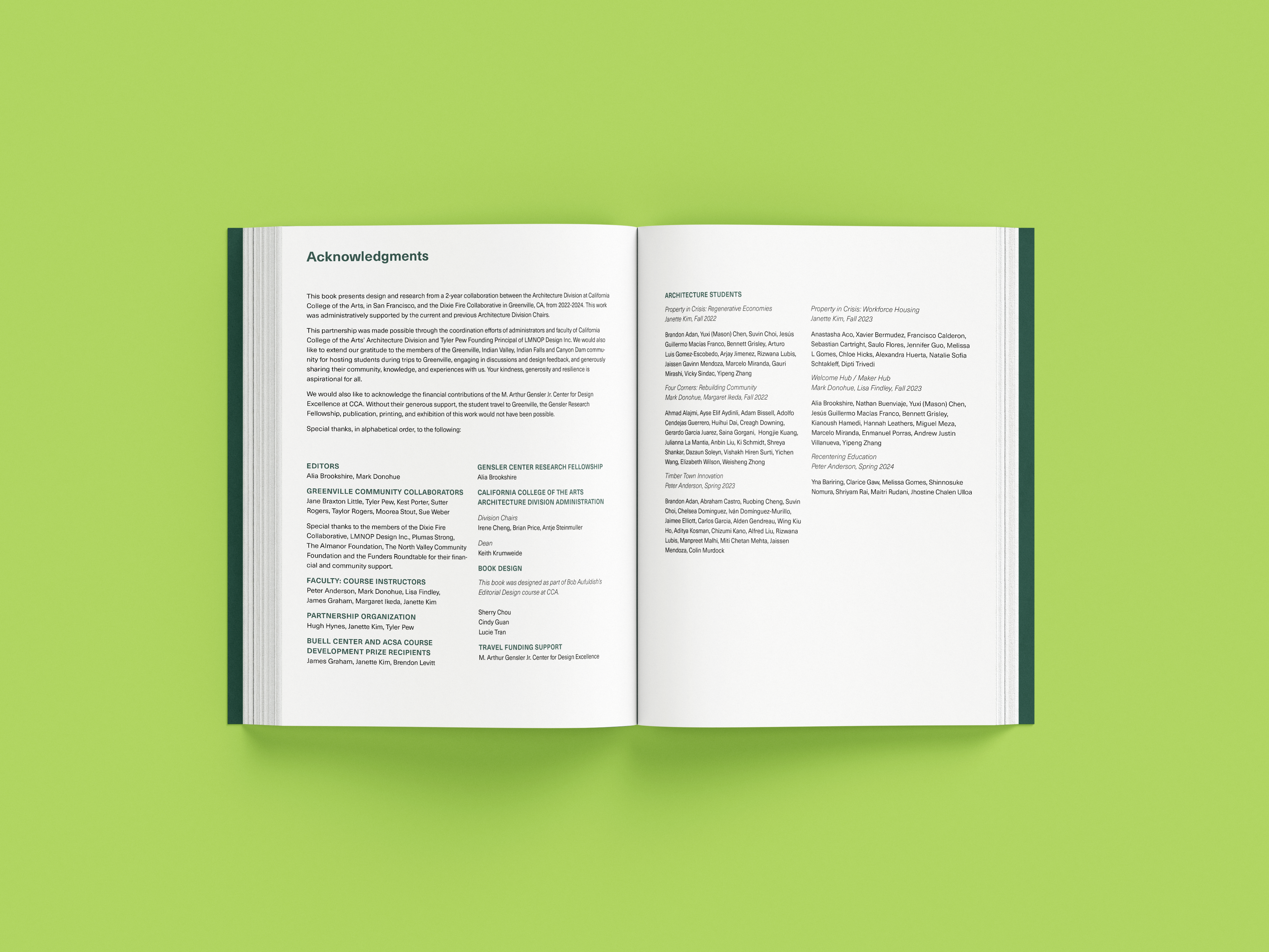 while taking bob aufuldish’s editorial design class, i was selected for an opportunity to design a book for cca’s architecture program. the program offered classes from 2022-2024 that gave students an opportunity to design new buildings and structures for the town greenville after it was almost completely destroyed by the dixie fire in 2021. this book is a documentation of their experiences, final projects coupled with stories from the townspeople who survived and hope of rebuilding.
